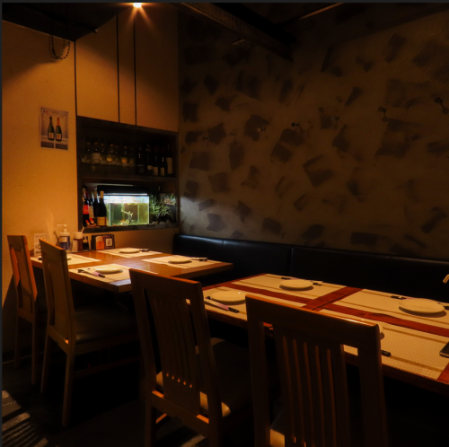 4名 水槽にも設置しており、お食事しながらお魚の姿を見ることができます。最高リラックスタイムです。スタイリッシュな店内を間接照明がやさしく照らします。貸切予約もOK♪プチパーティーやデートにぜひご利用下さいませ。